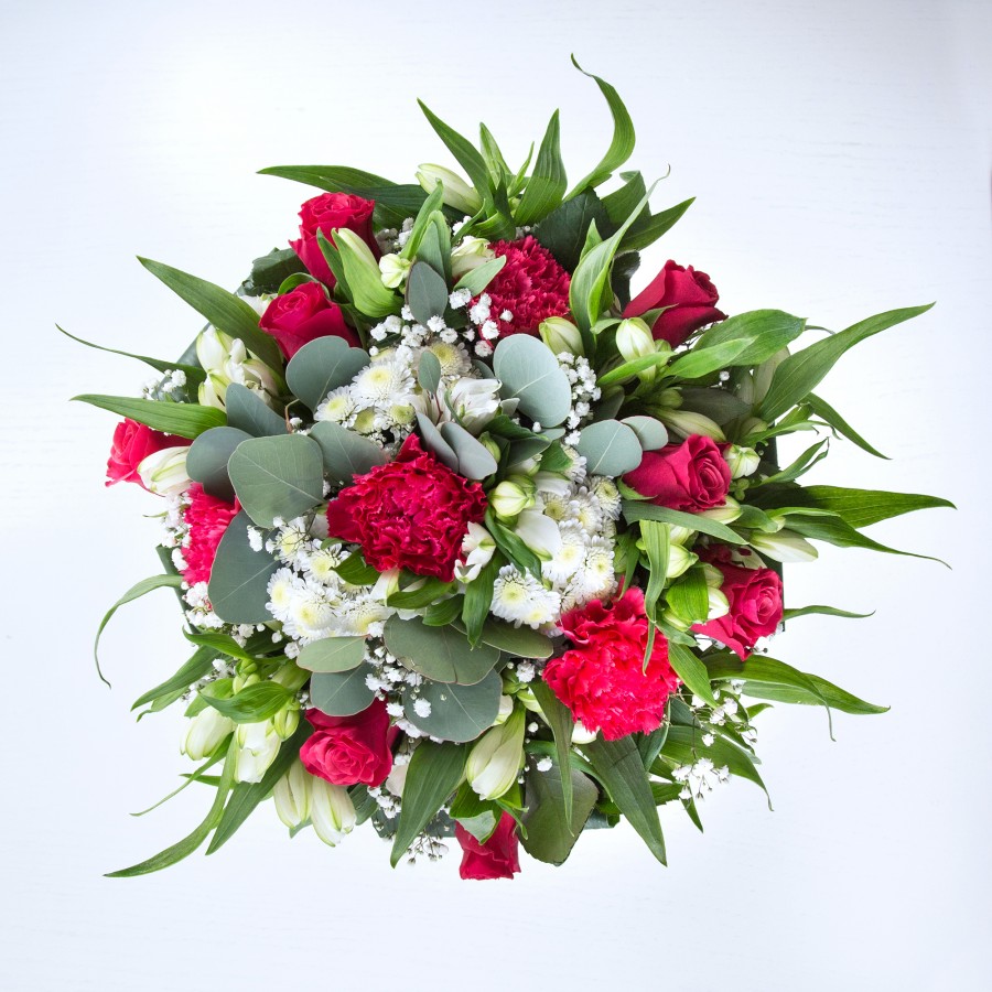 Immerse yourself in the beauty and uniqueness of our Exquisite Elegance Bouquet. This stunning arrangement showcases vibrant red roses intertwined with sweet white chrysanthemums, delicate gypsophila, and graceful white alstroemeria. Enhanced with lush aspidistra leaves, each stem is meticulously hand-selected to ensure unmatched freshness.
